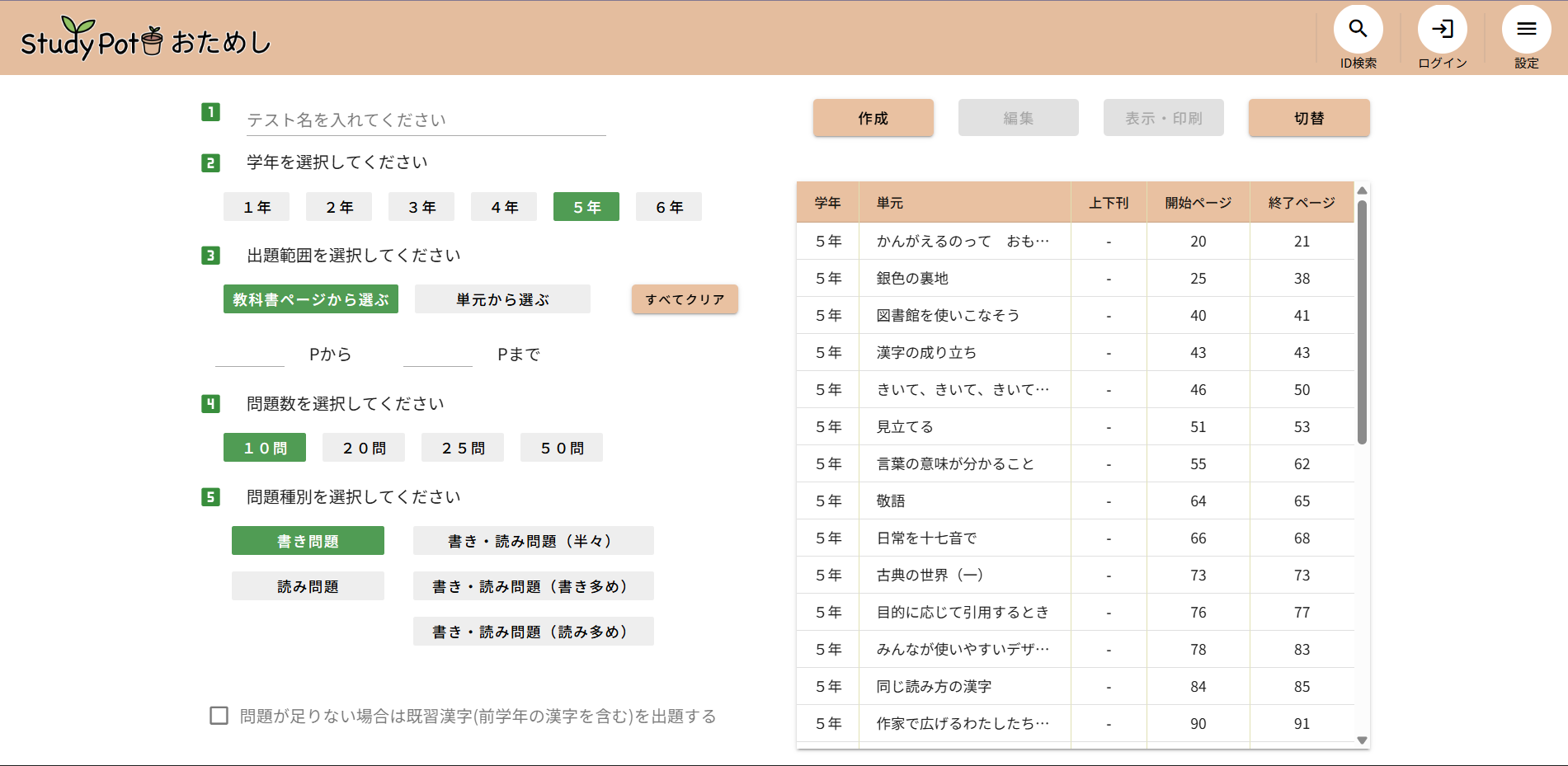 ●単元または、教科書のページ数の中の新出漢字でプリントを作成することができます。
