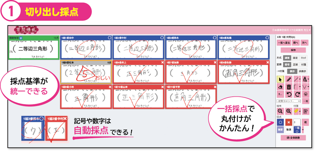 百問繚乱-日本標準エディション-は、「切り出し採点」ができることが特長です。1問ごとに児童全員分の採点を行うため、採点基準が統一できます。また、記号や数字は自動採点ができるので、採点時間を短縮することができます。