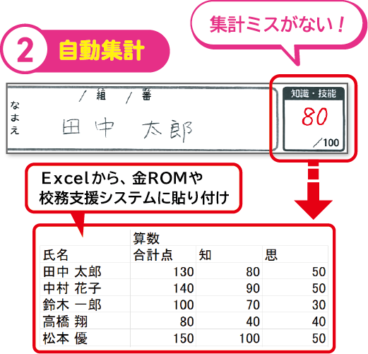 一問ごとに配点設定をしているため、採点を行うだけで点数計算を自動で行います。採点終了後の点数計算の時間がなくなり、かつ、集計ミスがないので、先生の負担が大きく軽減します。また、集計データはExcel出力可能です。金ROMや校務支援システムに貼り付けるだけで得点入力作業も終了します。