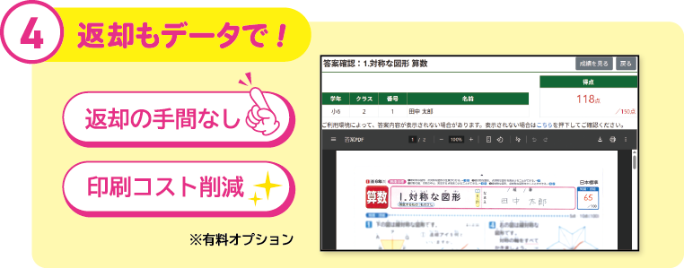 返却方法は、①印刷 ②データの2種類から選べます。有料オプションの「児童マイページ機能」を使えば、返却ボタンを押すだけで児童別にテスト返却が可能となります。マイページ機能を使えば、テスト結果の経年変化も可能となります。