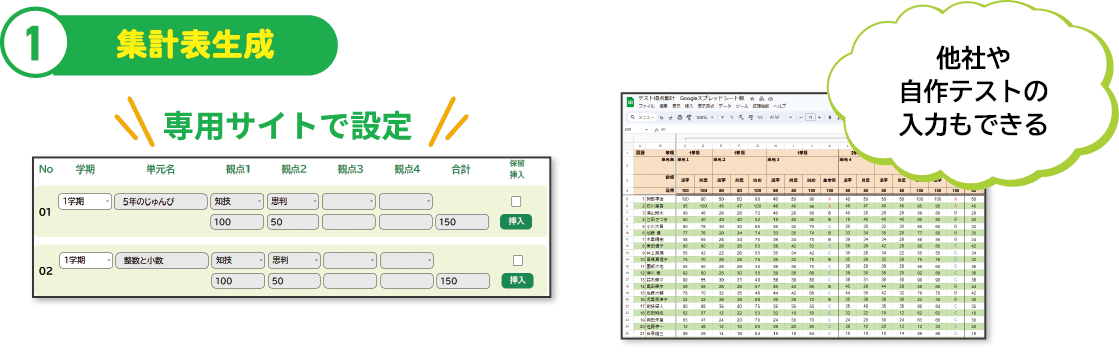 専用サイトで設定したテストの内容を、スプレッドシート版に生成します。日本標準のテストだけでなく、他社や自作テストの入力も可能です。