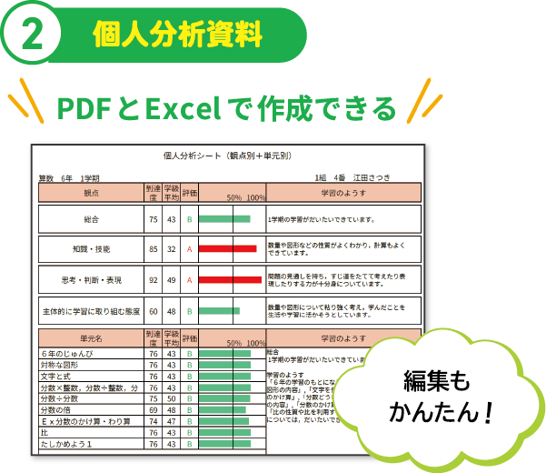 入力した得点データから、個人分析資料が作成できます。得点に応じて、評価文が自動で作成されます。また、Excelで作成された資料は、編集も可能です。