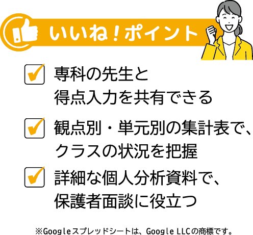 日本標準の得点集計ソフトは、Googleスプレッドシート版でも対応をしています。クラウドなので、端末や場所を選ばず作業ができるだけでなく、専科や教科担任の先生と得点共有が簡単にできます。