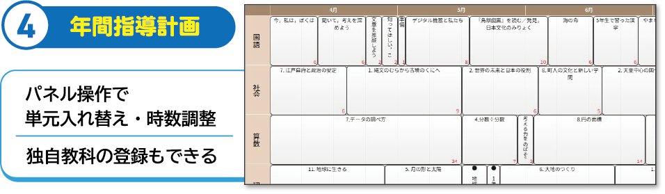 年間指導計画は、パネル操作で単元入れ替えや時数調整が行えるので、より直感的に作業できます。また、独自教科の追加もできます。