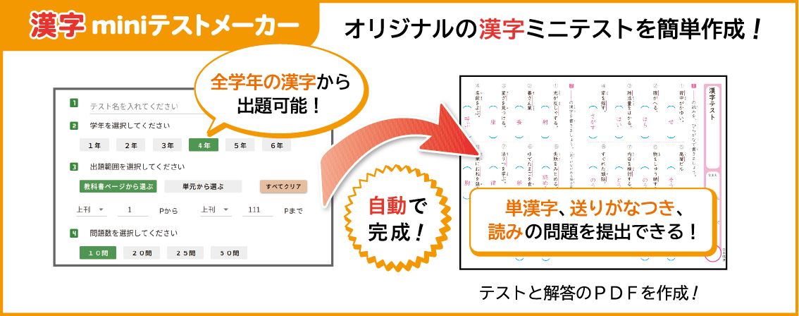 指定された教科書のページの中で取り扱う新出漢字のプリントを作成できます。