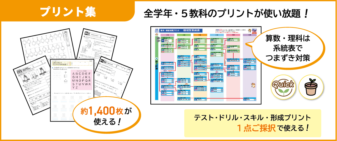 テスト・ドリル・スキル・形成プリント1点ご採用で、全学年・5教科のプリントが使えます。