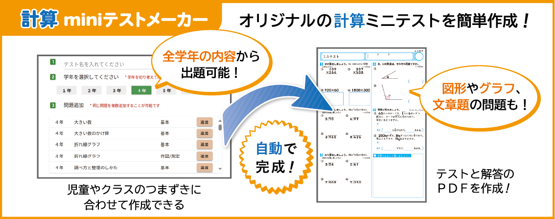 全学年の内容から出題ができるので、前学年の復習プリントも簡単に作成できます。